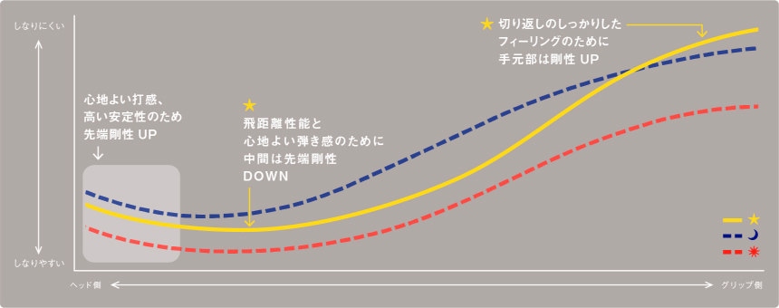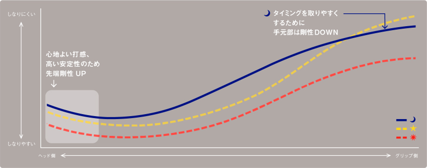 手元部はスイング中の切り返し時のタメを作りやすくするために剛性をやや落とし、中間部から先端部にかけて剛性を高くして無駄な動きを一切排除した設計です。左へのミスを怖がることなく思い切った力強いスイングで振り切れます。