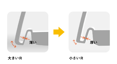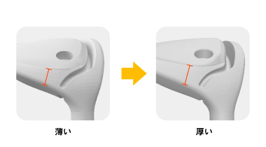 フェースを少しオープンに改良しつつも、前作並みのつかまり感を維持するために、ヒール側に重心を寄せるため、その部分の形状をやや厚めに設計しました。