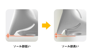 前作のノーマルソールは鋳造製法で製造していましたが、形状、重量配分、重心設計等、すべてにおいてハイレベルな精度が求められる今回は、ソール全体を個体差が少ないCNC加工で製造しています。