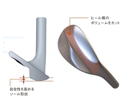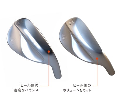 ①52度のソールは、ロングショット時の抜け過ぎによるミスショットを防ぐために、ヒール側に適度なバウンスを付けています。逆に58度は、あらゆる環境に応じてフェースを開閉しながら自在のショットを引き出しやすくするためにヒール側のボリュームを適度に落としています。