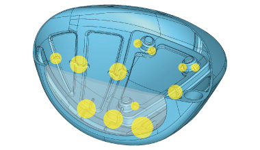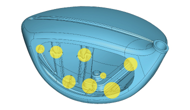 多くのRODDIOユーザー様は「飛ぶ、曲がらない」といったショットの結果だけにこだわるのではなく、「フェースにボールが乗る感覚の打球感」や「耳障りにならない打球音」等々、インパクト時の打球フィーリングを重視することも決して見逃してはならない設計事項でした。ロッディオ ドライバー ヘッド S デザイン オーバーサイズでは、「ソフトな打球感」というニーズを満たすために、重量を過剰に使うことなく多数の各要所に小さなリブを効率良く配置した独自の構造で設計されております。