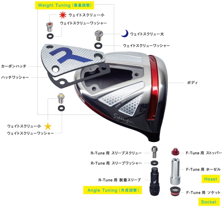※ヘッド一式には、ボディ、カーボンハッチ、スクリュー(ステンレス)3個、ロングノーマルホーゼル(Fチューンのみ)、ソケット/スタンダードデザイン/ブラッドオレンジ(F-Tuneのみ)、脱着スリーブ(R-Tuneのみ)が含まれます。