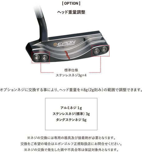 - オプションのネジを交換することで、ヘッド重量を±8gの範囲で変更可能