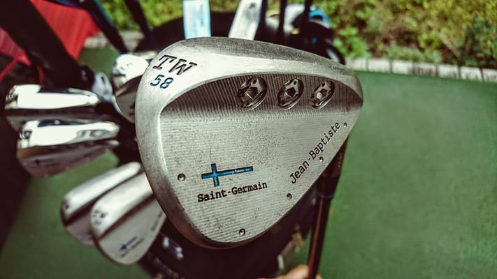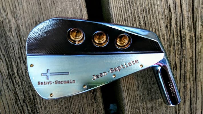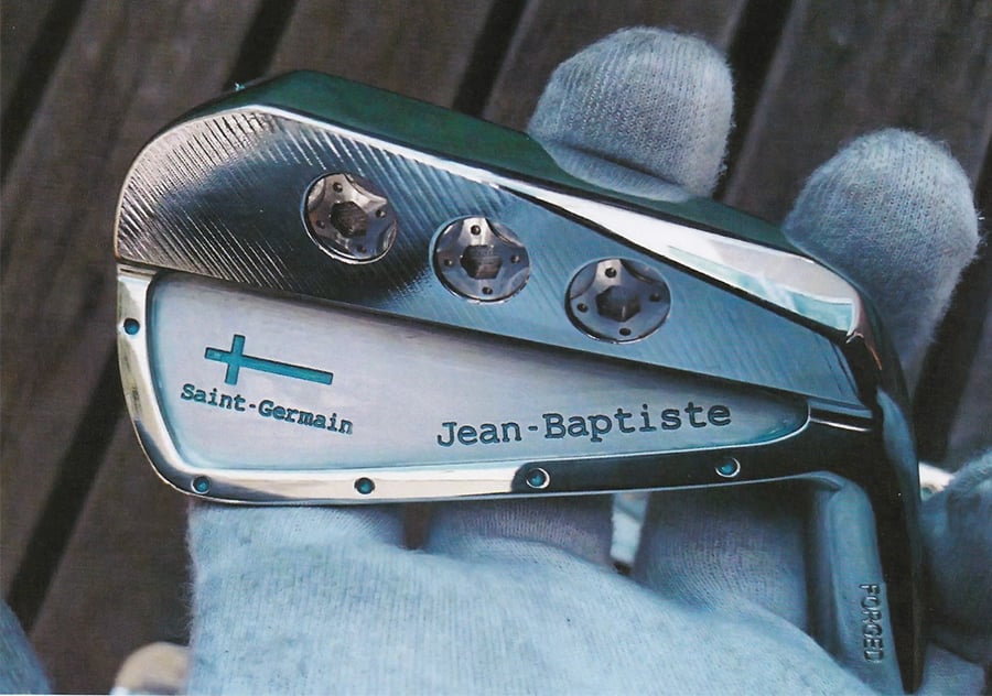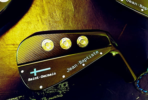 金型から鍛造で叩き出した後に、3次元高精度CNCミルドマシンにて削り出します。ソール、顔、ネック、ふところ、トップブレードなど細かいディティールを、サンジェルマンパターを研磨して頂いている、研磨職人の小林氏(FIエンジンの金型、カリスマ美容師の理容ハサミ、池田勇太プロの2016年版ヨネックスアイアンなど研磨)にお願いしています。そのため、サブネームのSaint-Geruman(サンジェルマン)が刻印されています。